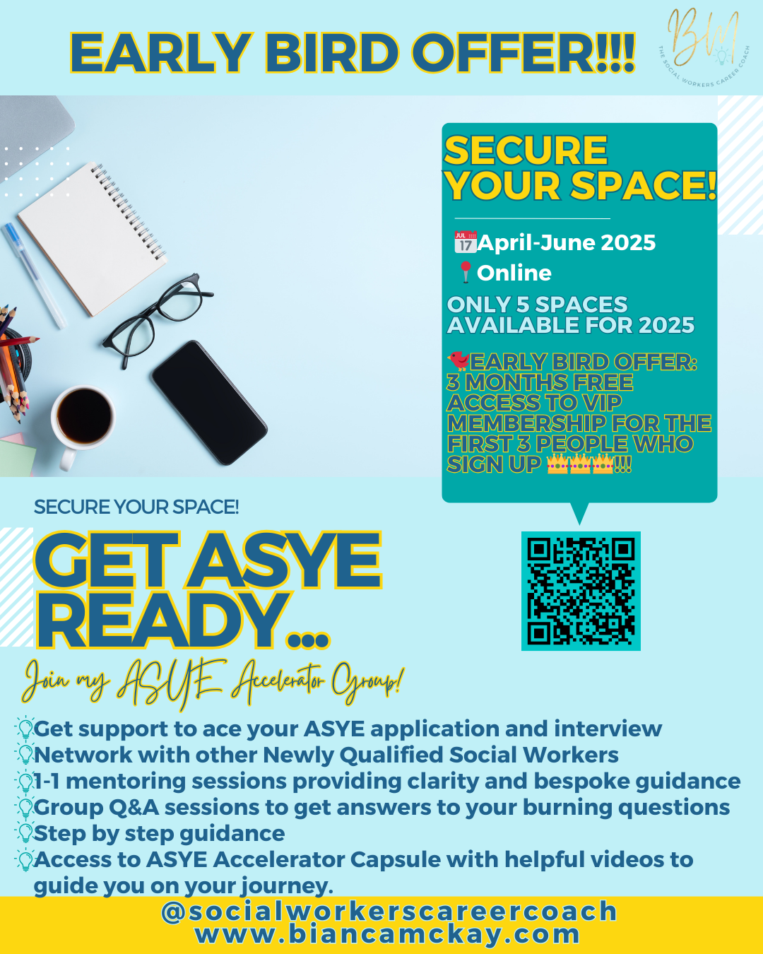 Early Bird offer- Access 3 months of VIP Membership 👑 for FREE as part of your ASYE Accelerator Capsule programme from April- June 2025. This is available for the first 3 social workers who join!