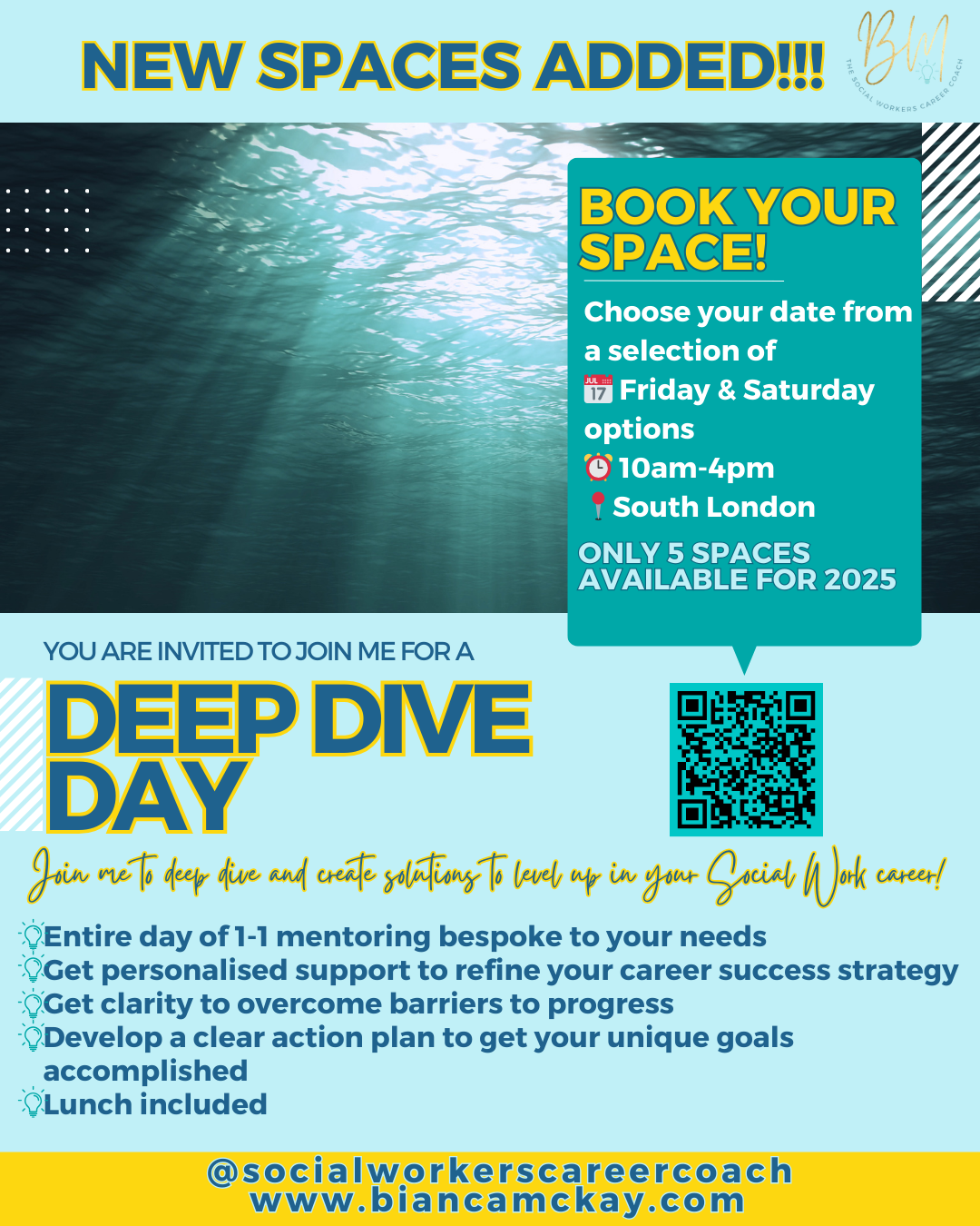 Deep Dive Days include an in depth analysis of your social work journey, including where you are now, and where you would like to be, as well as your lifestyle to ensure you are living in alignment with your goals. With my 1-1 guidance we will create a clear action plan bespoke to your needs. If you find yourself at a crossroads or in need of support, this is the opportunity to get all the support that you need in one day to fast track your progress.